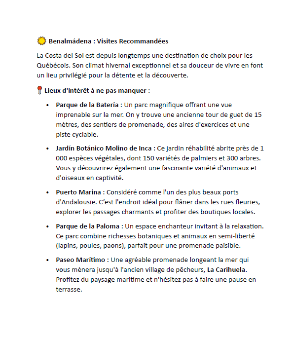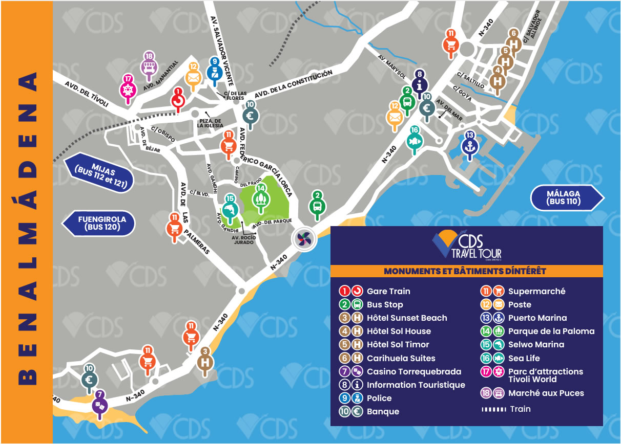 La ville compte des discothèques, hôtels, plages, centres commerciaux et un port de plaisance largement équipé. Elle compte aussi des attractions touristiques suivants comme l’Aquarium Sealife et le Selwo Marina, des parcs d’attractions avec des dauphins, des pingouins et des phoques entre autres. Le Parc La Paloma est un ajout plus récent, c’est un parc paysager comprenant un grand lac et des animaux sauvages et espèces menacées.